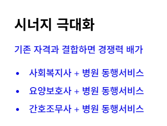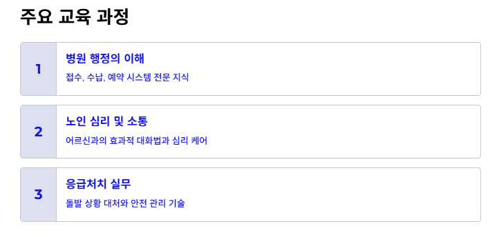 | 병원 행정의 이해 | 접수, 수납, 예약 시스템 숙지 | 병원 동행서비스 자격증 필수 |